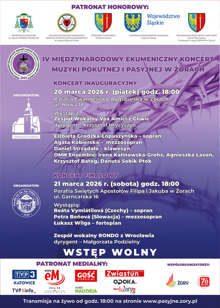 Międzynarodowy Ekumeniczny Koncert Muzyki Pokutnej i Pasyjnej odbędzie się 20 i 21 marca 2026 r. w kościołach żorskich parafii: Ewangelicko-Augsburskiej oraz Św. Apostołów Filipa i Jakuba.