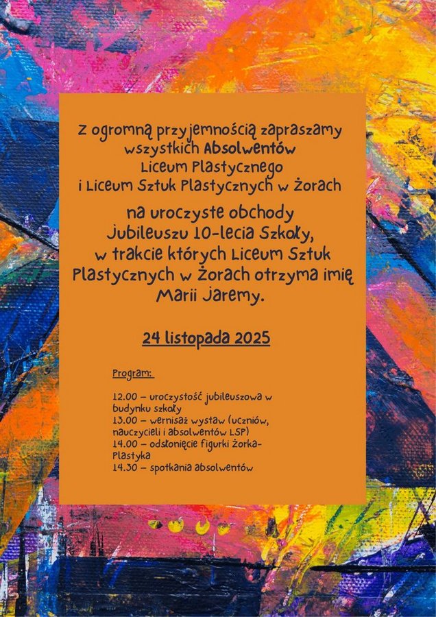 Wydarzenie odbędzie się 24 listopada w budynku szkoły, który na ten dzień zamieni się w prawdziwą galerię sztuki. Podczas jubileuszu nastąpi uroczyste nadanie szkole imienia Marii Jaremy - artystki, malarki, rzeźbiarki i scenografki, która swoją twórczością inspirowała kolejne pokolenia artystów. To symboliczny moment dla szkoły, która od dekady kształci młodych ludzi wrażliwych na piękno, otwartych na artystyczne poszukiwania i odważnych w wyrażaniu siebie.