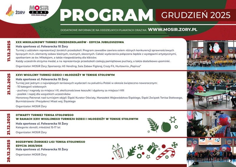 | 28.12.2025 | Rozgrywki Żorskiej Ligi Tenisa Stołowego edycja 2025/2026 Organizator: MOSiR Żory |