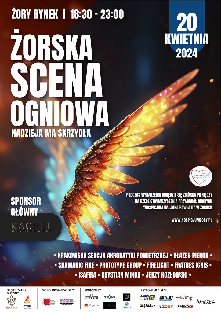 Żorska Scena Ogniowa to impreza charytatywna organizowana już po raz trzeci. W tym roku bohaterem zbiórki charytatywnej jest Stowarzyszenie Przyjaciół Chorych "Hospicjum im. Jana Pawła II" w Żorach.