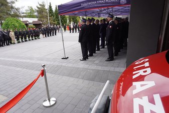 Przecięcia wstęgi dokonują od lewej: Grzegorz Sobik – Prezes OSP Rogoźna, Waldemar Socha – Prezydent Miasta Żory, Piotr Kosztyła – Przewodniczący Rady Miasta Żory,Adam Grześkiewicz – dyrektor ŻCOP oraz oraz mł. bryg. Krzysztof Ograbek – Komendant PSP Żory.