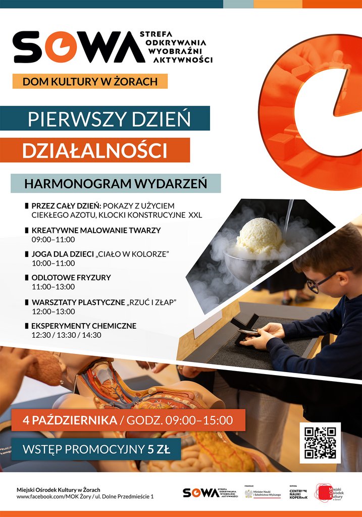 4 października (SOBOTA) zapraszamy na Pierwszy Dzień Działalności Strefy SOWA Żory! W godz. 9:00–15:00 czeka na Was mnóstwo wyjątkowych atrakcji – bilet promocyjny tylko 5 zł!