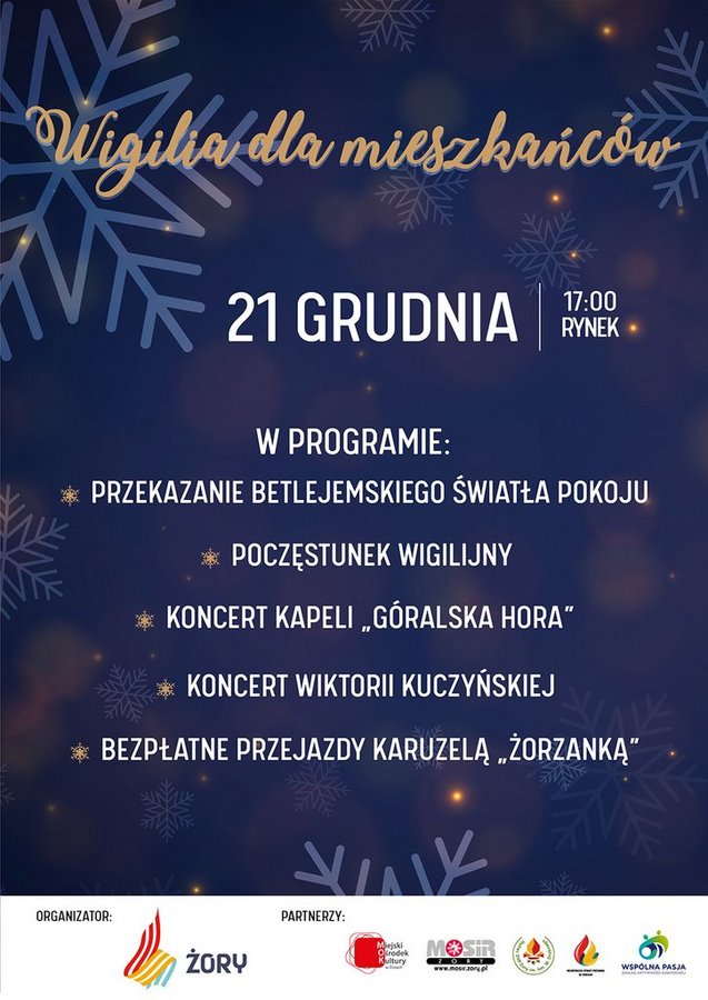 21 grudnia - w sobotę poprzedzającą Wigilię, o godz. 17.00 nastąpi przekazanie betlejemskiego światła pokoju, połączone z wigilijnym poczęstunkiem i koncertami w wykonaniu kapeli Góralska Hora oraz utalentowanej mieszkanki Żor, Wiktorii Kuczyńskiej. Będzie też można skorzystać z bezpłatnych przejazdów karuzelą Żorzanką.