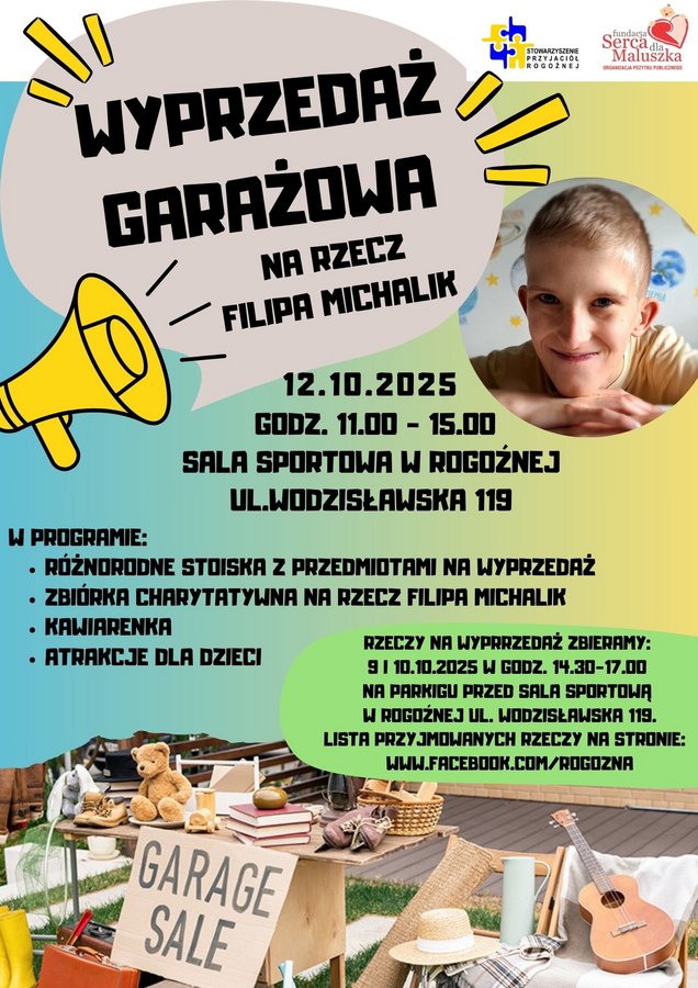 Przedmioty na wyprzedaż można dostarczać do sali sportowej w Rogoźnej w dniach 9 i 10.10.2025 r. w godz. 14.30-17.00. Lista przyjmowanych rzeczy znajduje się na stronie www.facebook.com/rogozna