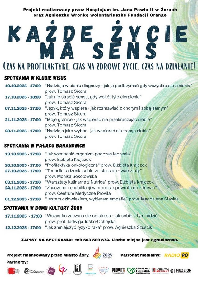 Partnerzy: Miasto Żory, Stowarzyszenie Przyjaciół Chorych "Hospicjum im. Jana Pawła II" w Żorach, MOK Żory, Pałac Baranowice, Żorskie Centrum Organizacji Pozarządowych, Miejska Biblioteka Publiczna w Żorach, Muzeum Miejskie w Żorach, PSONI Koło w Żorach, Górnośląska Fundacja Onkologiczna".